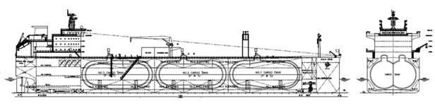 - Three(3) bi-lobe independent cargo tanks of IMO type C which to be designed with a maximum pressure of 3.72 bar g, a minimum temperature of -163ºC and a maximum cargo specific gravity of 0.50.
