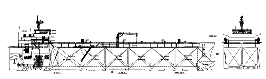 - The vessel to be of fully welded, the deck transverse beams, girders and deck longitudinal to be arranged on upper deck in the cargo area, and to have a forecastle with bulbous stem, a vertical transom stern, a semi-balanced hanging rudder and a large-diameter, slow rotating, high efficiency fixed pitch propeller.