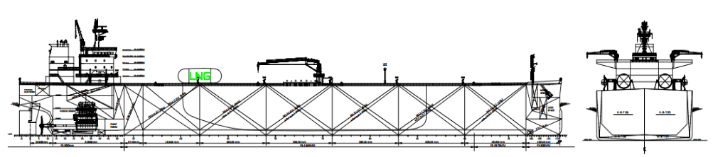 - Fully welded continuous upper deck without forecastle, a raked stem with bulbous bow, a transom stern with open water type stern frame, a semi-balanced rudder and fixed pitch propeller directly driven by a slow speed dual fuel engine.